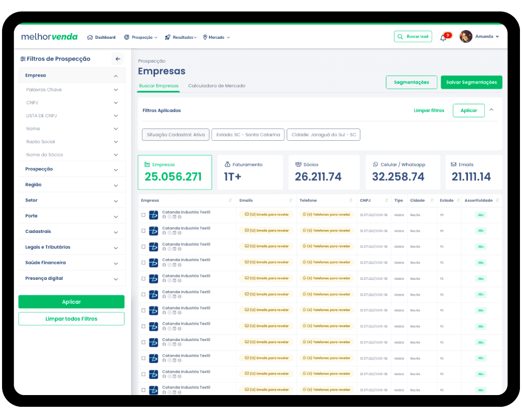 Defina seu cliente ideal (ICP) com mais de 100 filtros inteligentes e acesse + de 25 milhões de empresas e seus decisores. Direcione sua energia pra quem realmente tem potencial de compra.