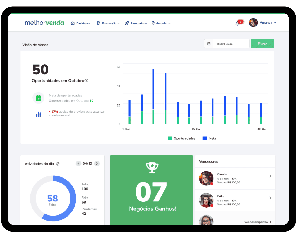 Com nossa exclusiva plataforma de gestão da carteira de prospecção, você define metas para sua equipe, organiza a cadência de contatos, acompanha atividades em tempo real, e o melhor: analisa os resultados de cada ação e vendedor com precisão e agilidade.